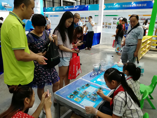 展會現(xiàn)場-工作人員給來訪人員介紹DIY學生實驗制作解決方案產(chǎn)品及學生們展示DIY制作標本