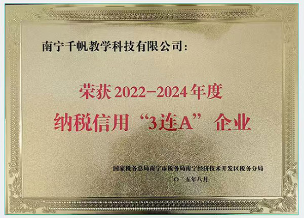 南寧千帆教學(xué)科技有限公司榮獲2022-2024年度納稅信用“3連A”企業(yè)。